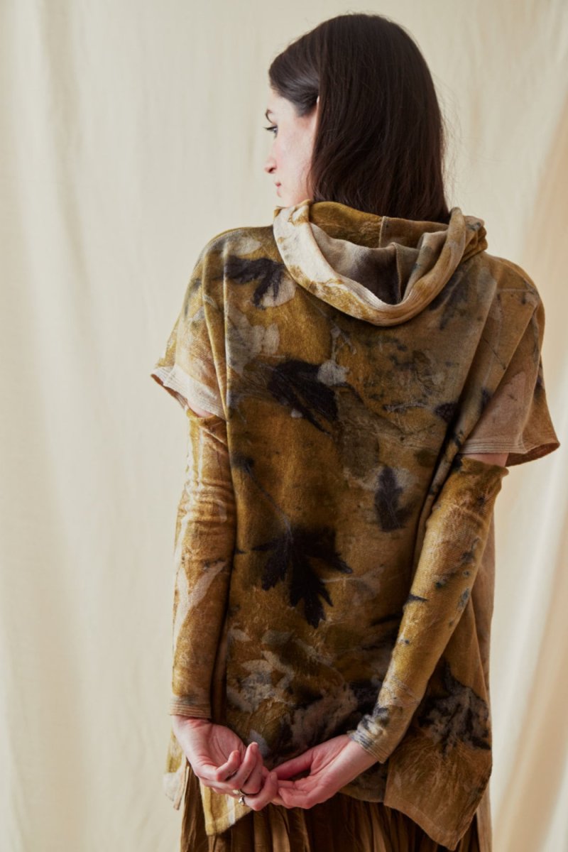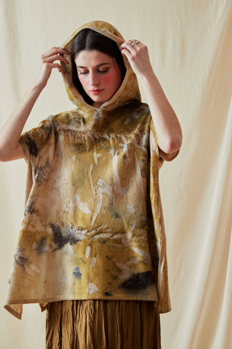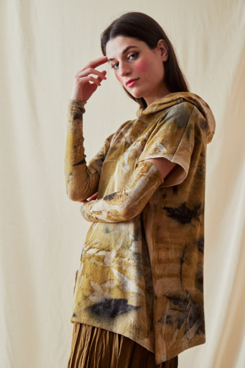 Ce pull large couleur or à capuche figure aussi dans la collection d’ASKA ! Ses touches personnalisées : des manches amovibles ! et un imprimé original fait selon la technique eco-print. A porter avec tous les types de pantalons comme les jupes bohème.