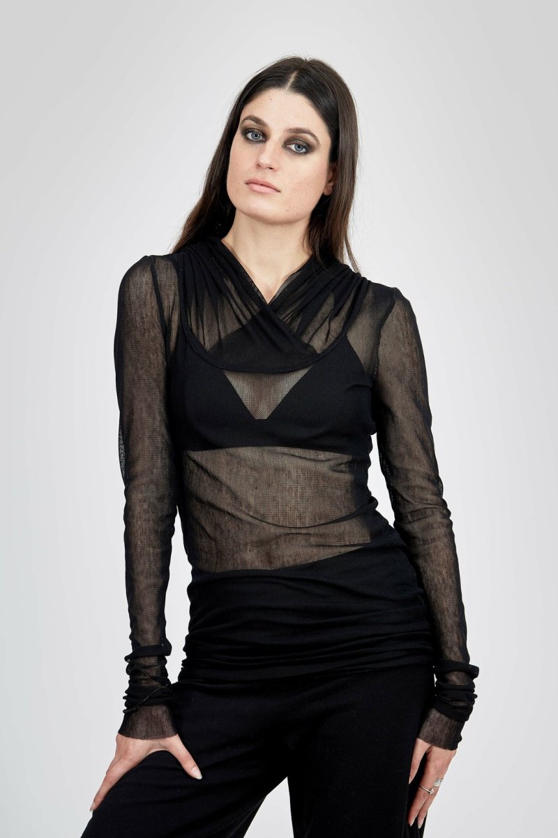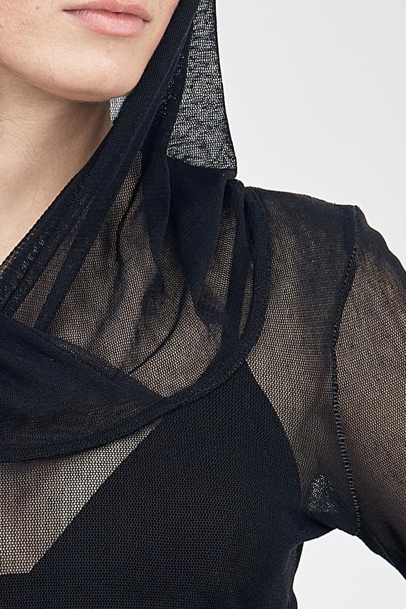 Tunique à capuche hoody en résille noire pour femme MOON. La féminité triomphante avec cette tunique ajourée près du corps et à manches très longues, qui se drapent autour des poignets.